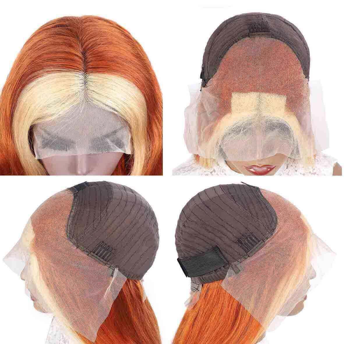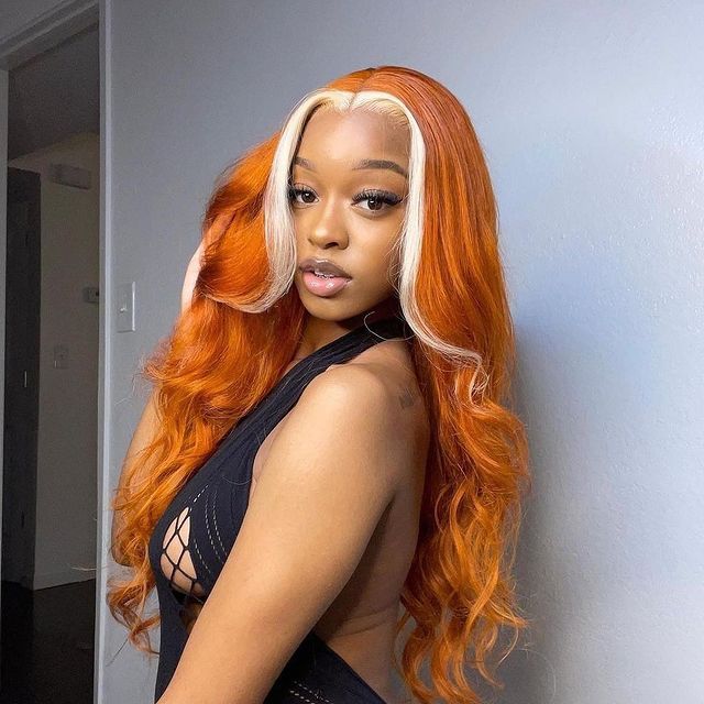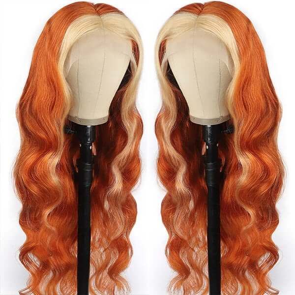 Ginger Hair Color with Blonde Highlights Body Wave Lace Frontal Wig Human Hair Skunk Stripe Wig
